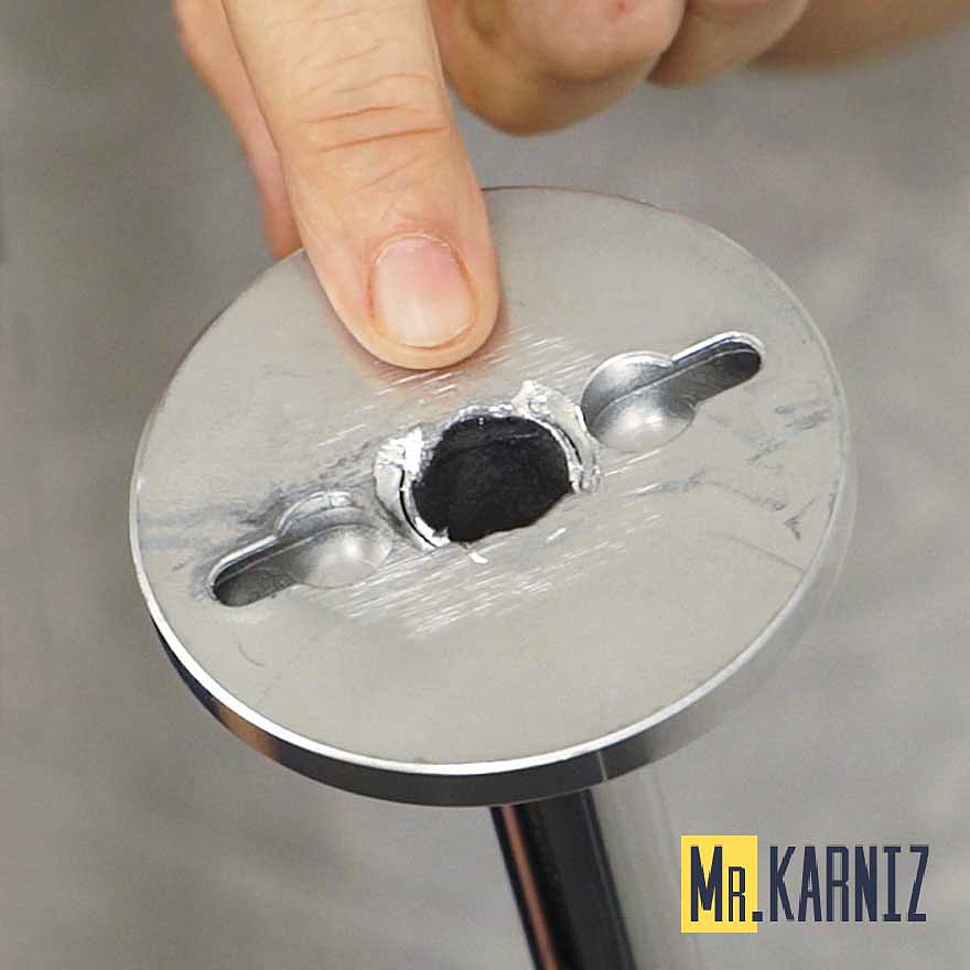 • В нашем примере два отражателя различной толщины металла. Первый так же как и предыдущий, выполнен методом штамповки из тонколистового неизвестного сплава. Сверху покрыт хромом. По цвету незначительно отличается от трубы из нержавеющей стали. Имеет «зубцы» для плотной посадки на карниз, но при их надевании неизбежно царапает трубу, так как его сперва нужно сдвинуть от крепления карниза, что бы крепление прикрутить. Во втором материал нержавеющая сталь. Такой же зубец, но выполняет функцию резьбы для навинчивания его на кран. Так же царапает трубу, а еще просто мозолит глаз данной выемкой.