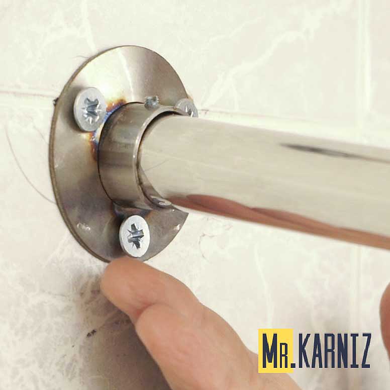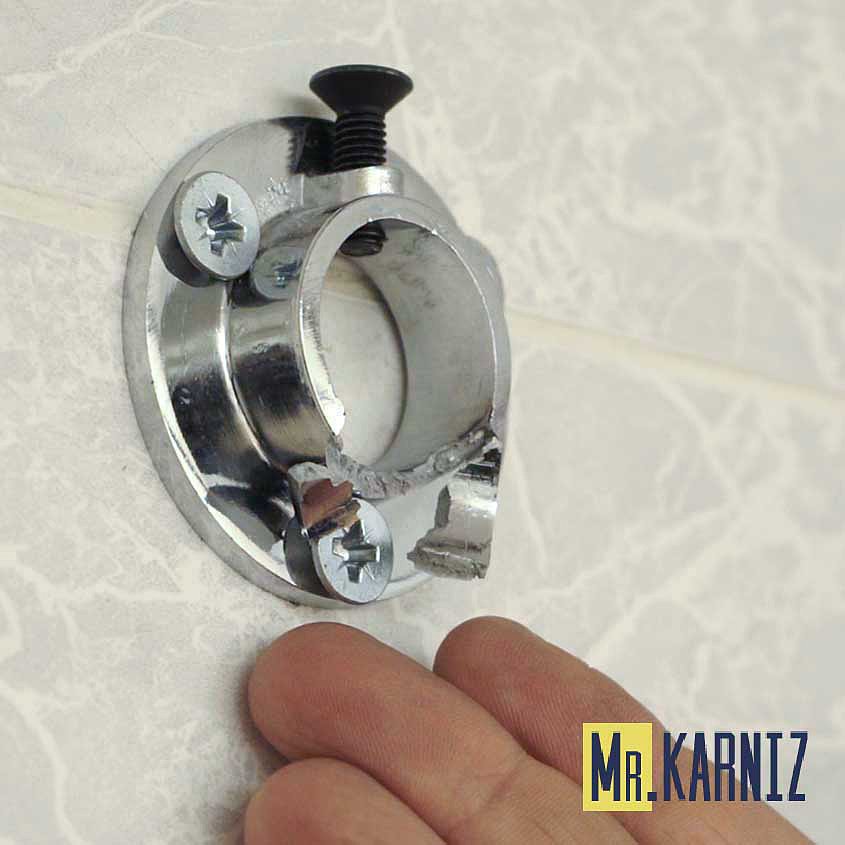 Другая причина провисание или выпадения карниза связанная с фиксирующим болтом проявляется спустя какое-то время пользования. Изменение нагрузки на штангу карниза, которое обычно связано с намоканием и высыханием шторы для ванной, заставляют трубу слегка изогнуться в месте, где висит дополнительный груз. Данный естественный изгиб трубы выдавливает фиксирующий винт или же деформирует трубу. Что приводит к выпадению штанги из крепления.